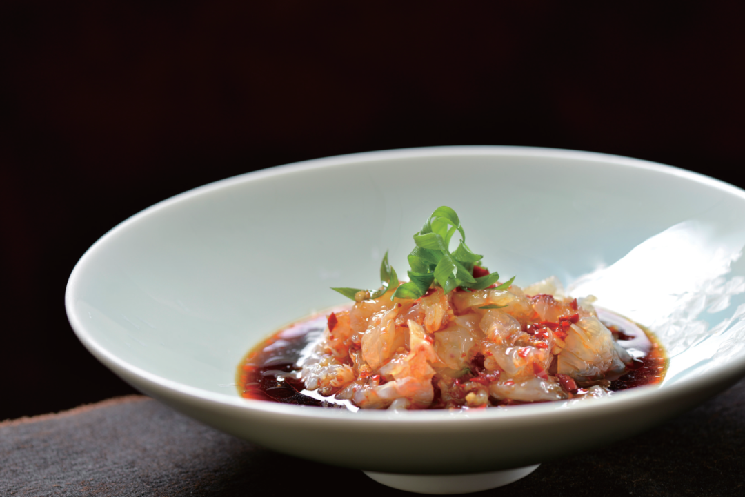 2.取适量矿泉水纳碗,放入小米椒碎浸泡出味,调入盐、鸡精、味精、豉油、白糖、香醋、葱油搅匀,成酸辣回甜的味汁,再浇在盘中海樱花上,撒上葱花即成。