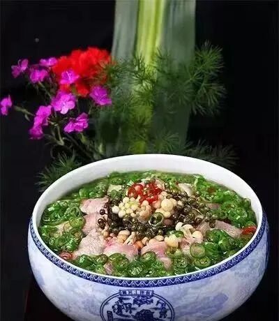 3.往锅里倒入韭菜汁,烧开后加盐、鸡粉、美极鲜酱油和辣鲜露调好味,出锅倒在盛有肥牛卷的盘内,最后舀上用热油炝香的青椒圈和青花椒,即可。