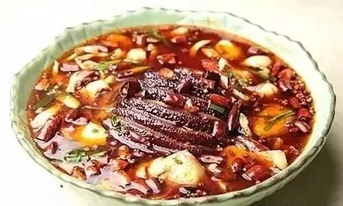 锅内放入色拉油,烧至六七成热时下入小料爆香,放入老干妈辣酱、豆瓣酱炒出红油,倒入除青蒜苗段之外的原料和二汤,大火烧开,改中火烧6分钟,用盐、鸡粉、酱油调味,出锅装入容器内,撒入青蒜苗段.红油、藤椒油放入锅内,烧至七成热时出锅,浇在青蒜苗段上。