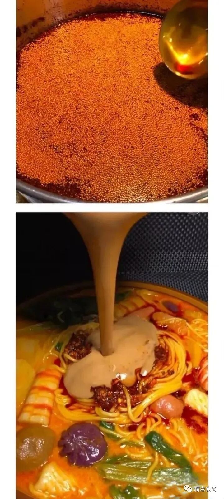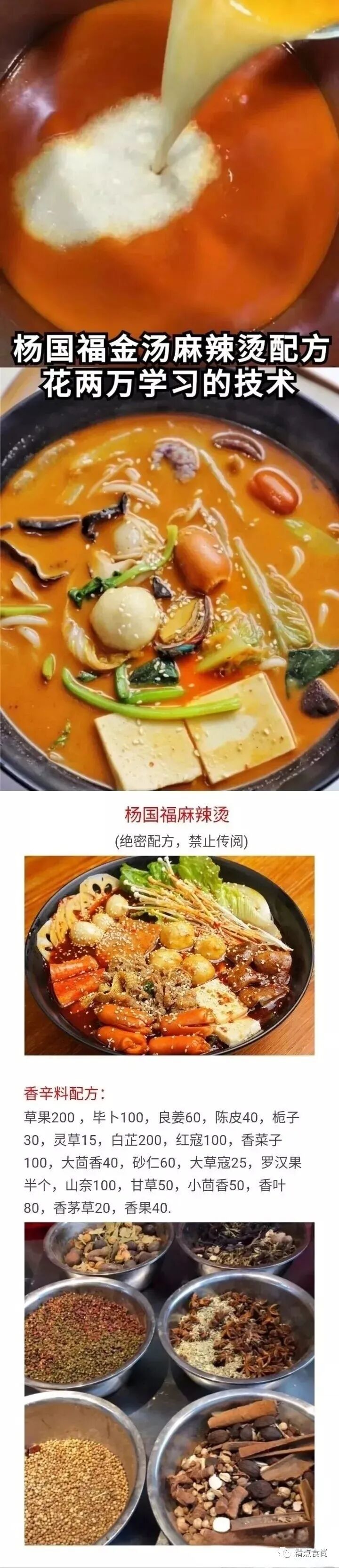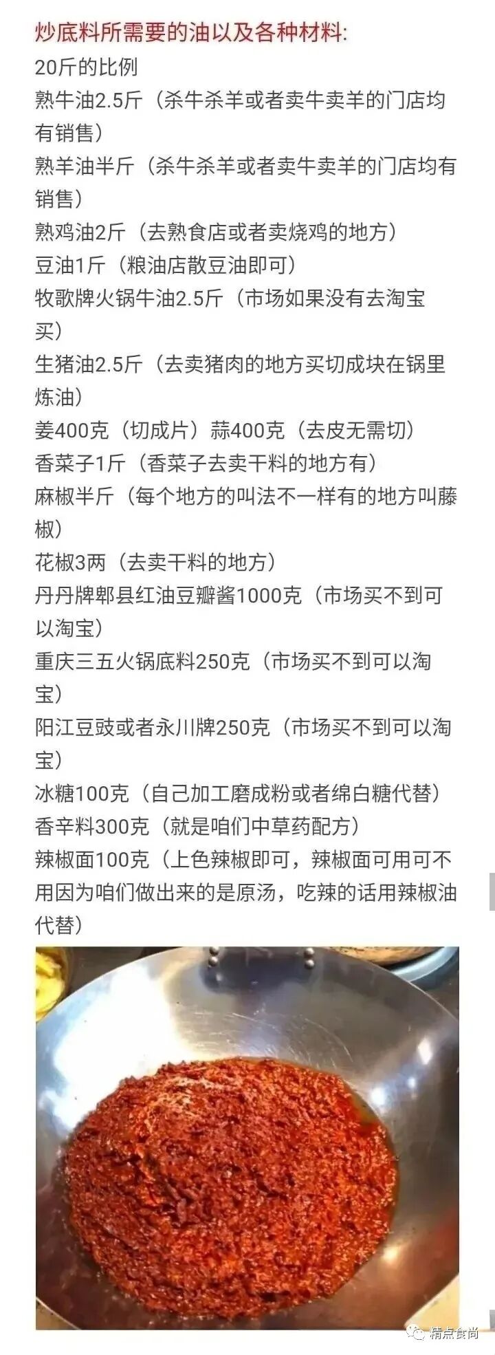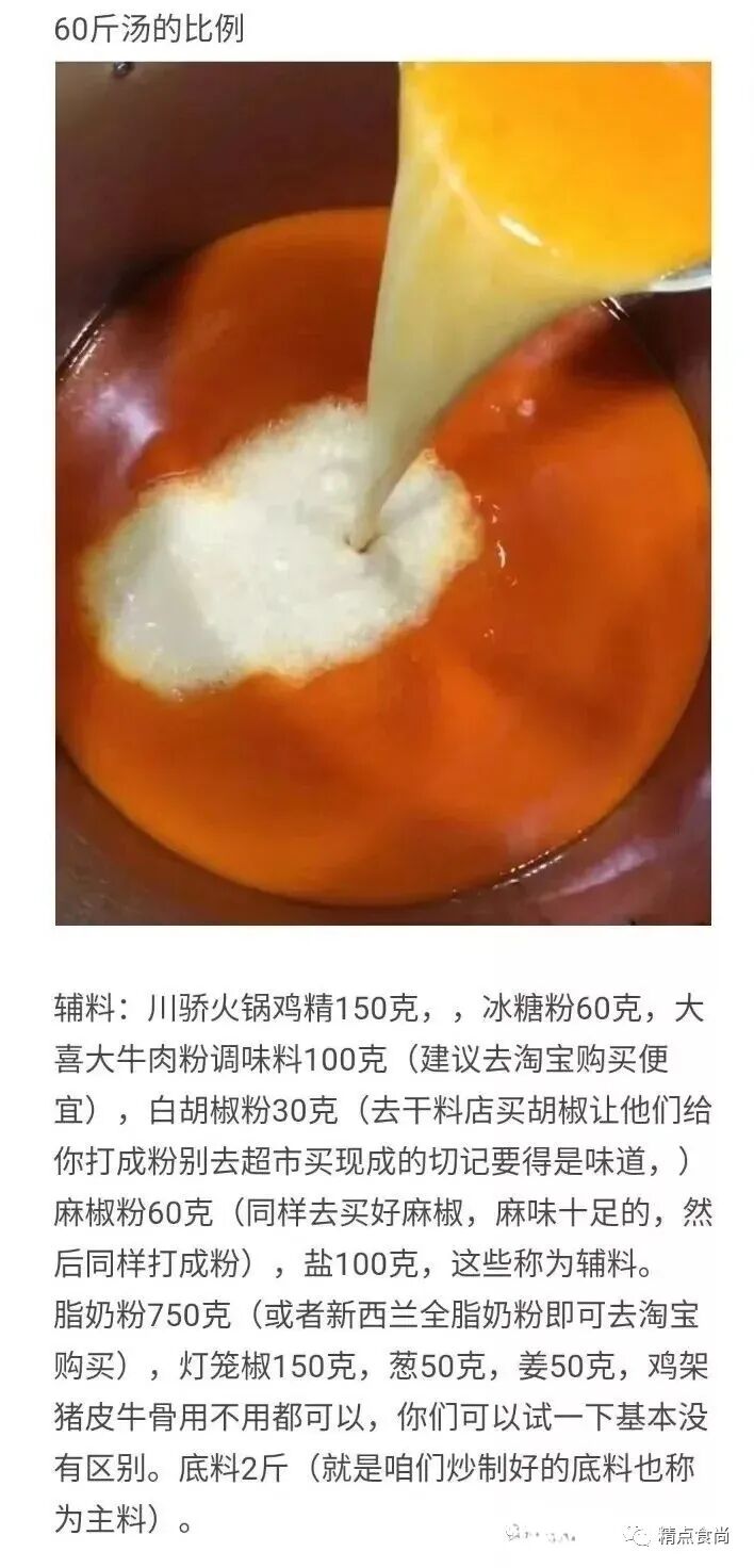 调味料:味可淳大蒜粉30克,津大牛肉香精30克,津大猪肉香精30克,莲花味精200克,大厨四宝浓缩鲜香粉200克,小丑娃特鲜一号300克, 川骄火锅鸡精200克,星湖呈味酸二钠1+G200克(建议去淘宝买,比市场便宜很多,买这些产品的时候看销量,哪个销量高就买哪一个),里面只有-款是食品添加剂,星湖呈味酸二钠(国家允许的放心使用,咱们吃的金锣火腿肠、雪米饼等等一些之类的全部有它), 其他七个都是调味料,所有产品可以去安检。金锣高汤牛骨风味1 500克. (操作方法: 1500克高汤+ 500克水,在锅里搅拌匀熬制冒泡即可,然后放边上不用管炒底料,最后一步直接倒入锅内,此产品可用可不用)无论你是厨师也好,还是饭店大老板也好,或者从事麻辣烫多年也好,或者你没有经验,记住来到这里吧心态归零,第一次练习把我给你的比例降低十分之一去练习,就是2斤的量,感觉成功了就可以4斤、8斤,翻倍练习累计。再以此往上类推,千万切记。炒底料操作:把豆油倒入锅内,把切好的猪肉倒入锅内去炼制。炼完把渣子倒掉即可。倒掉完渣子之后把剩下的四种油放入锅内油温上升180.温度上升180度放入姜与蒜炸至金黄色捞出即可。180度放入香菜子1分钟(炸之前过一下水即可防潮180放入麻椒1分钟即可。180度放入花椒即可。香菜子、麻椒、花椒,炸完关火捞出即可。温度下降140-160放入郫县红油督办将1分钟不停搅拌。放入重庆三五火锅底料花开即可。放入豆豉1分钟即可。放入冰糖粉滑开即可。放入香辛料分三次倒入不要结块,不停搅拌。放入辣椒面20秒左右。放入调味料分三次撒入,同样不停搅拌。之前炼制好的金锣高汤与水直接倒入锅内关火搅拌3到5分钟即可。(放入高汤之后会很粘稠, 很难搅拌的正常现象)底料抄完以后,把酱摊匀即可。上边是油 下面是酱,问着没有糊味即可。晾凉以后会凝固,用保鲜膜封起来,放入冰箱保存即可。冬天直接封起来放入边上,夏天直接放入冰箱。48小时后方可使用,这样更入味。刚开始炒可能不好掌握,如果炒的过程中没有掌握好,糊了,直接倒掉即可。温度掌握不好会糊要么就是苦,直接影响口感,另外就是我指定的牌子千万不要换,因为这样我不能给你们保证味道,如果你们自己换掉,味道会漂的,我就给你们保证不了了。
