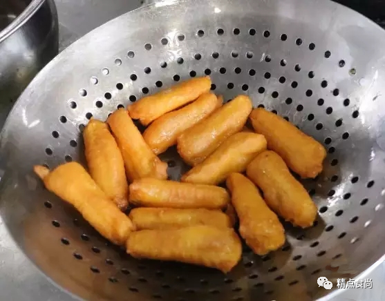 下入锅内炸至金黄,边炸边用勺子搅拌