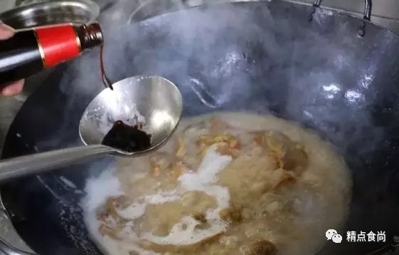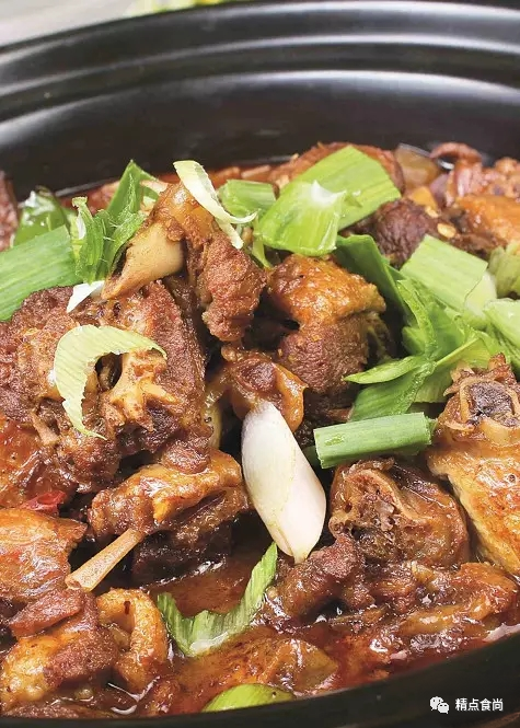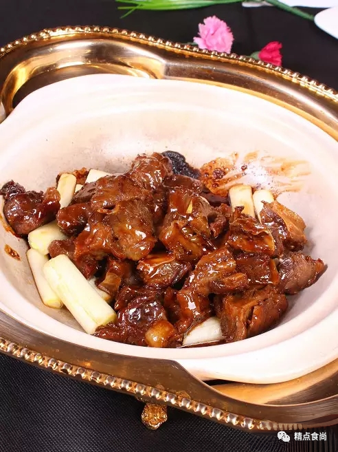 取一份牛肉以及原汁入锅烧开,舀入山西散装老陈醋100克收浓,盛入垫葱段的热砂锅中即成。