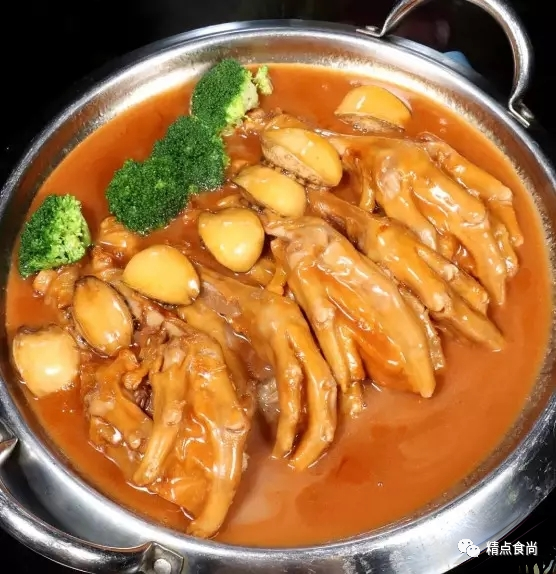 浓汤调味,倒入蹄花、鲍鱼、鹅掌,烧沸后焖制3分钟,加蚝油,改小火收汁。