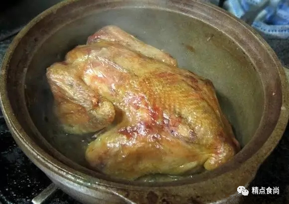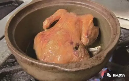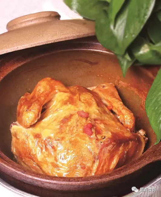 2.嫩鸡15只宰杀治净(重约900克/只),冲净后放入茶香水浸泡2小时,取出沥干水分,分装入15个砂煲,放入蒸箱大火蒸20分钟,此时鸡皮微黄,因蒸汽渗入,砂煲底部已有汤汁,取出放入烤箱,调至底火150℃、面火170℃烤40分钟,待鸡皮金黄、鸡油渗出,取出放置一旁备用。