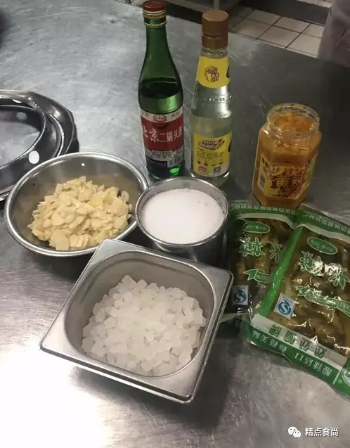 1.取一个不锈钢大桶,放入龙井茶叶500克,冲入70℃热水15千克泡开,加盐250克,香葱、姜片各180克,香料粉80克,干花椒40克搅匀,自然晾凉后倒入酒酿汁800克,放入冰块4000克搅匀,制成茶香水备用。
