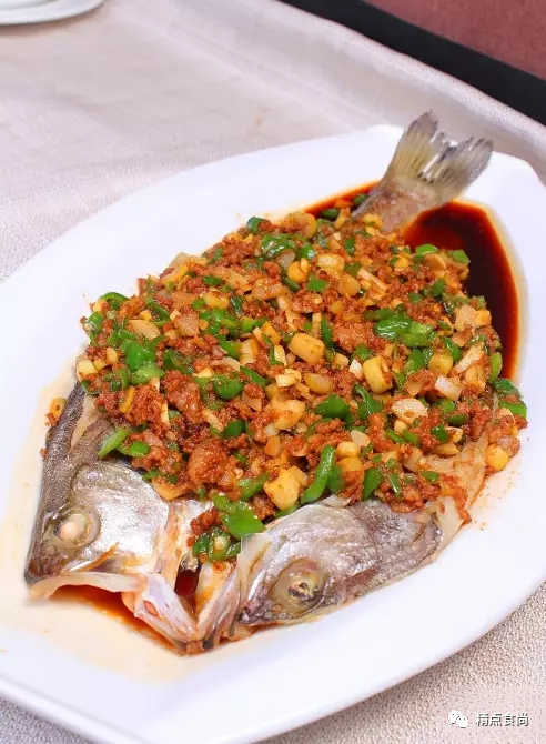 黄花鱼置于常温下自然解冻,去鳞、去内脏,在细流水下冲20分钟,从背部下刀一剖为二,在鱼身两侧分别打花刀,摆入盘中,放入蒸箱蒸4分钟,取出滗出蒸汁,趁热倒入自制豉椒料40克,激入热油10克即可上桌。