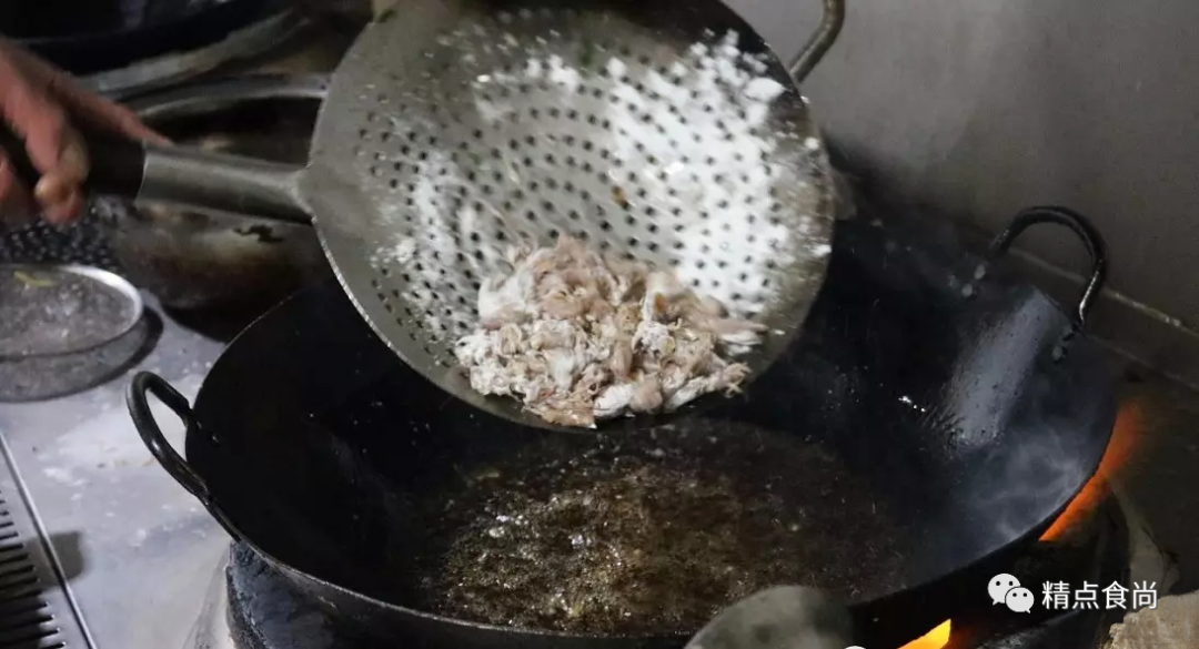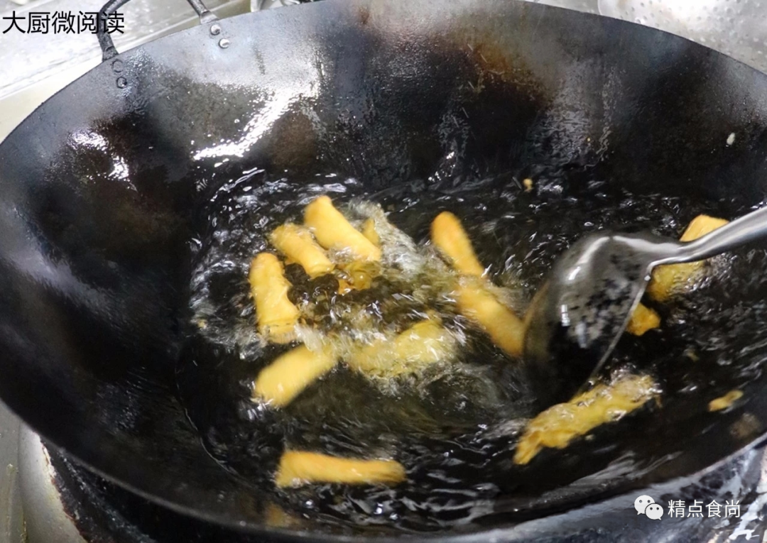 4.锅内油升温至五成,再下里脊中火复炸至酥脆,呈金黄色。