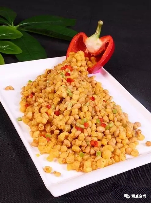 此菜由“咸蛋黄焗南瓜”“松仁玉米”两道甜菜融合改良而来,将鲜玉米粒拍粉炸酥,焗上一层咸蛋黄,再撒酥黄豆、松仁,成菜既有玉米粒的鲜甜,又有蛋黄、松仁、黄豆的浓香,口味富有层次,大受女士、儿童的欢迎。