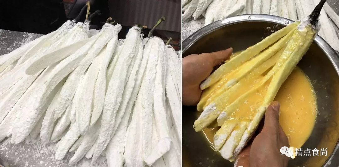 2.选用长25厘米、大小均匀的长茄,洗净去皮,保持蒂部相连,将茄身改刀成手指粗细的长条,入清水浸一下,捞出均匀拍生粉、裹蛋液、粘面包糠,下入六成热油中火炸50秒至表面金黄酥脆,捞出沥干油分,取两根茄子装盘,点缀花草带一小碗自制番茄酱走菜。