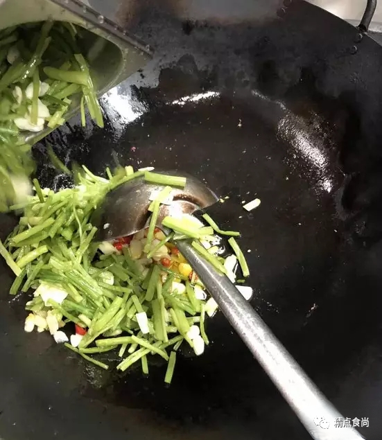 3.锅放菜籽油烧热,另加生蒜片适量爆香,捞入芹菜段煸炒出香,关火后盛到托盘内摊开晾凉,放入无水的干净盛器中,封膜后进保鲜冰箱存放,随用随取。