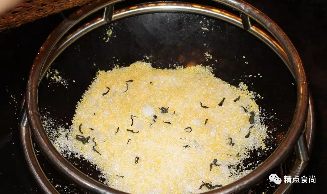 将由小米、白糖、茶叶组成的熏料撒入锅中,上面放金属架子