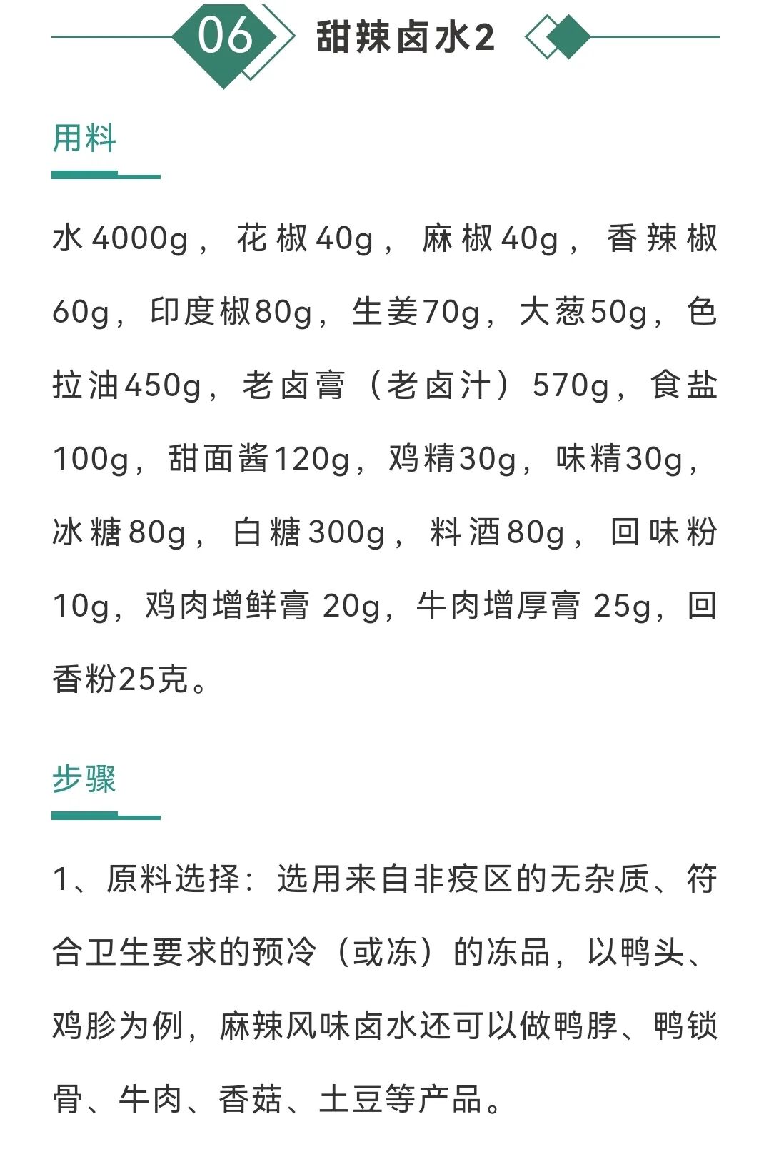 本文着重介绍6款我们实验室常用的五香卤水、麻辣卤水、甜辣卤水、白卤水,其中五香卤水经典美味,最适合我们的猪肉、鸡肉、牛肉等大块肉类,咸鲜可口、香味十足。说起麻辣风卤水,我们就会不自觉想到川卤,辛辣,麻,入骨香和肉香融为一体,才能视为正宗四川风味。色泽艳丽,食用后具有芳香,爽口和新鲜的味道,回味悠长,进食后不会感到油腻。甜辣风味卤水,以“周黑鸭”为代表,因其色泽黄黑而得名,它皮黑肉嫩、醇厚不腻、香鲜美味,具有“甜中带辣,辣中带麻,麻中带香,香味入骨”的特点。白卤汤要求色泽乳白又不失香气,但是选料比较讲究。