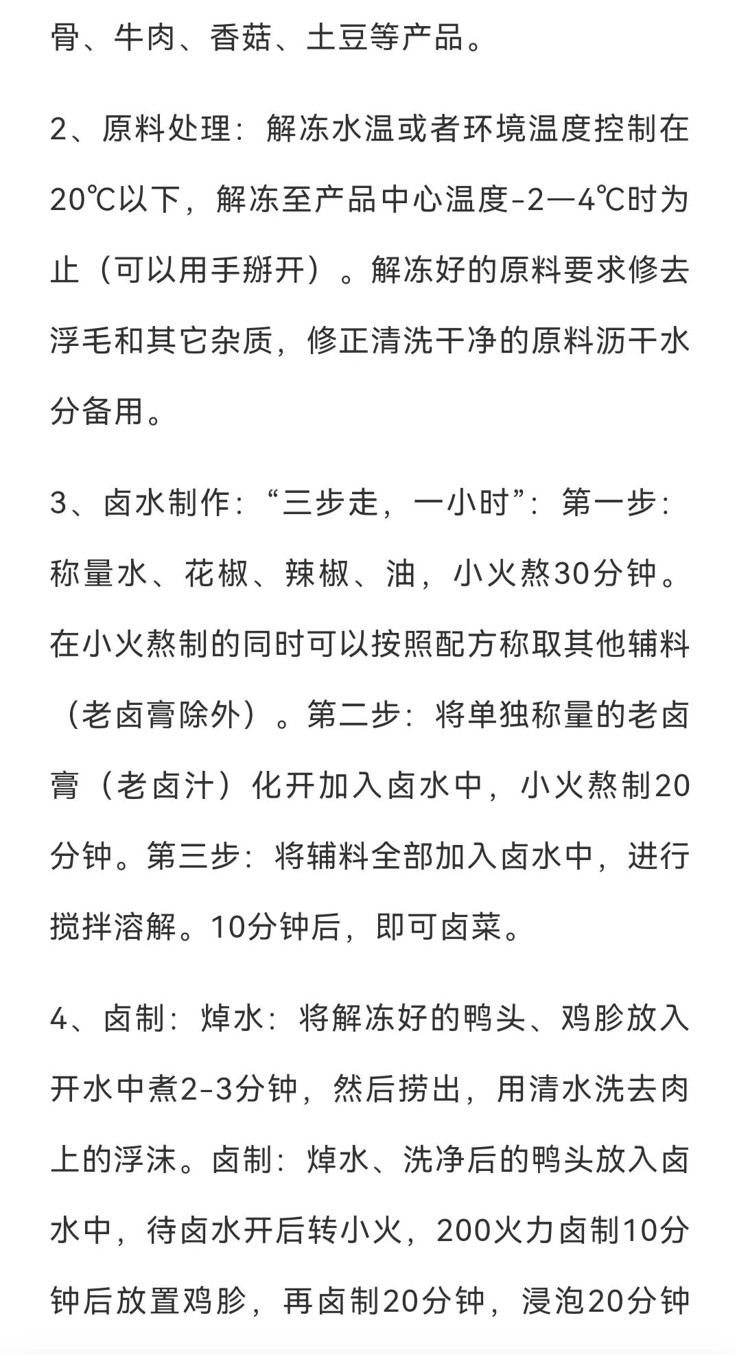 1、原料选择:选用来自非疫区的无杂质、符合卫生要求的预冷(或冻)的冻品,以鸭头、鸡胗为例,麻辣风味卤水还可以做鸭脖、鸭锁骨、牛肉、香菇、土豆等产品。