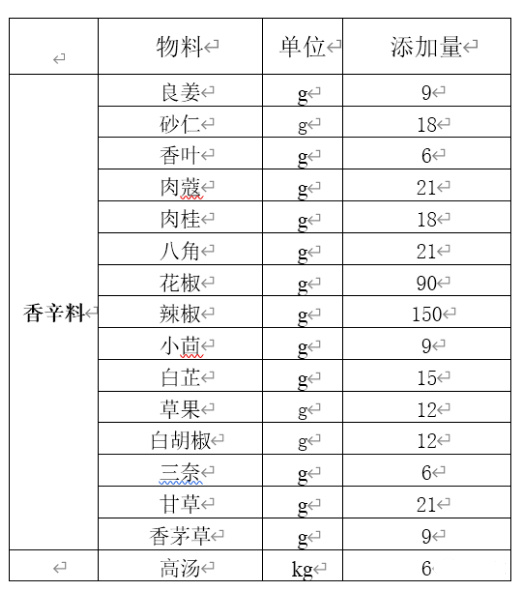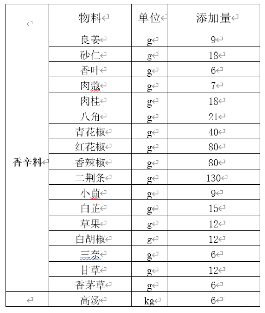 八角12克、山柰10克、红花椒5克、白豆蔻5克、陈皮10克、香叶8克、白芷5克,香葱30克,生姜30克,白酒150克,盐60克,鸡精30克,回味粉125克,骨汤2500克。