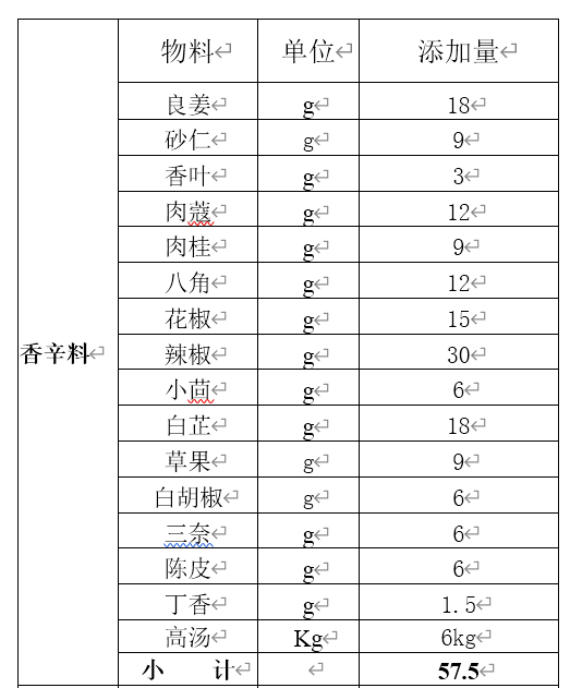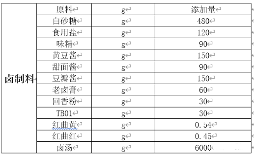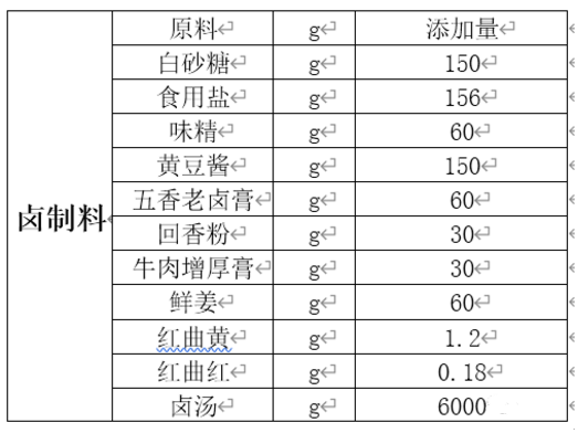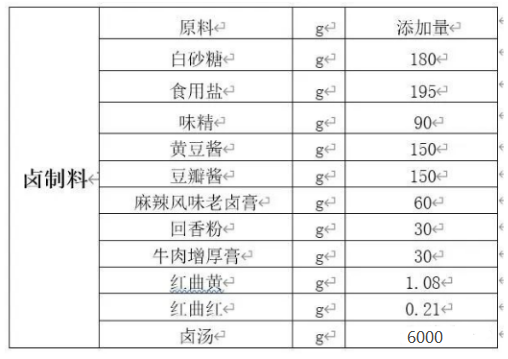 水4000g,八角15g,桂皮15g,良姜15g,白芷15g,香叶3克、丁香3克,生姜70g,大葱50g,色拉油450g,五香老卤膏300g,食盐80,鸡精30g,味精40g,冰糖60g,白糖150g,料酒80g,黄豆酱200g,回味粉10g,鸡肉增鲜膏20g,牛肉增厚膏25g,回香粉25克。