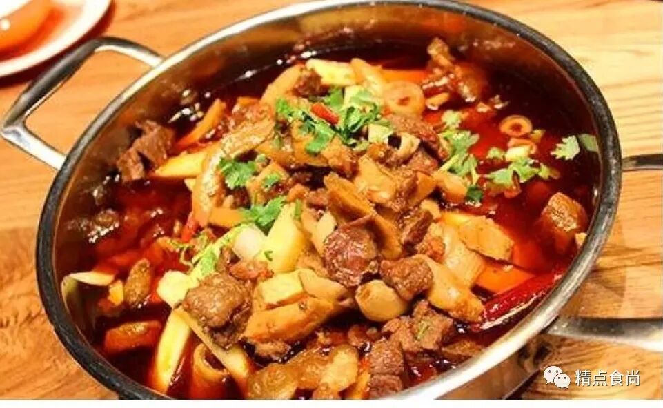 5、炒锅下入专用料油70克,下入干辣椒节、蒜子和自制酱料炒香,下入肉料和牛杂略做翻炒,加酱油3克、味精3克,卤肉酱汤700克,鲜汤300克,红枣,枸杞小火烧开入味,盛入垫有圆葱、胡萝卜砂锅内,浇入烧热的料油200克,点缀少许香菜即可上桌。