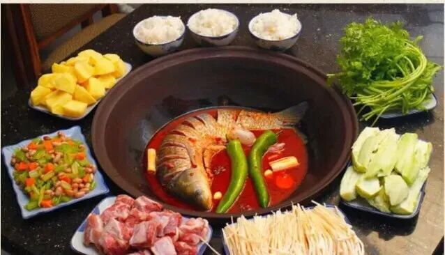 姜片60克,五花肉片100克,大蒜片50克,草果一个,肉扣一个,八角一个,香叶一片,小茴香2克,青麻椒1克,花椒1克,干辣椒段5克,三合酱100克,高汤4000克,尖椒粒10克,香菜段50克,大葱段50克,三合油300克,草鱼1750克(清洗干净)