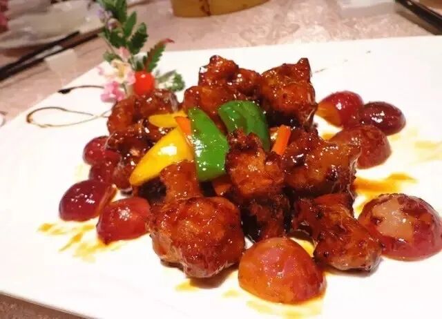 2.净锅放少许的油,下姜片、八角和香叶炒香后,掺适量的清水并下肉排、红米、红酒、提子和少许的盐,待小火焖熟后取出来,改刀成小块装盘,往上边浇适量的原汁便成菜。