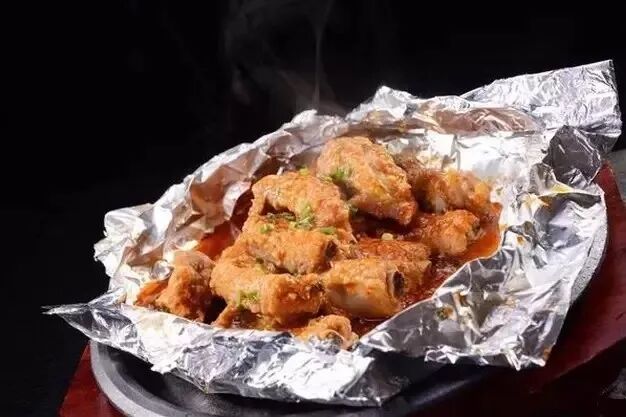 5.净锅上火滑锅留油,将压好的排骨回锅收汁勾芡,摆在锡纸中,撒葱花,再把锡纸周围卷紧,放置烧热的铁板上即可。