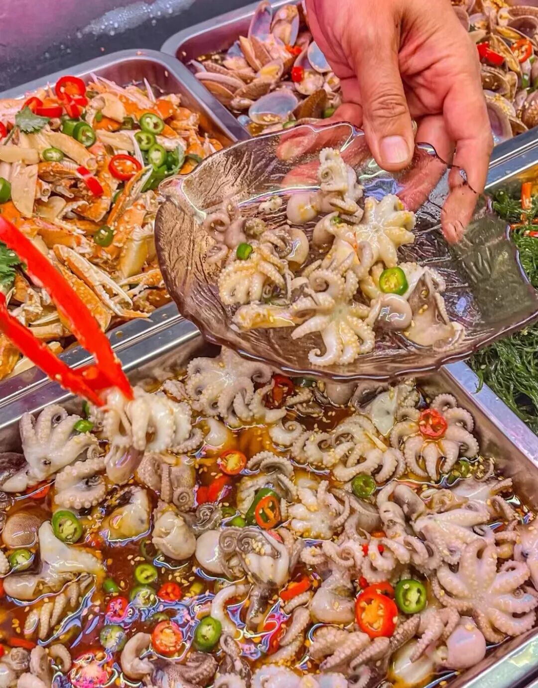 蟹钳:采用沙蟹蟹钳,冲洗半个小时以上,充分祛除腥味直接腌制(可以加入辣根去除腥味)。香螺,钉螺,花螺,大脚螺,小海螺,小鲍鱼仔,生蚝等:小海鲜冷水下锅,大火烧开后煮至2分钟左右至熟捞出后自然放凉(也可投凉)。青虾:冷水煮熟捞出投凉。海带,藕块,金针菇,杏鲍菇:焯水煮熟冷水拔凉。小扇贝,海螺蛳,花甲,白蚬子,蛏子,黄蚬子,麻蚶子等:开水下锅煮至1分钟左右开口至熟捞出投凉备用龙虾尾:入220度油锅里15-30秒至熟捞出晾凉备用。虾爬子,花盖蟹,河蟹等:大个原料适合蒸熟晾凉备用。