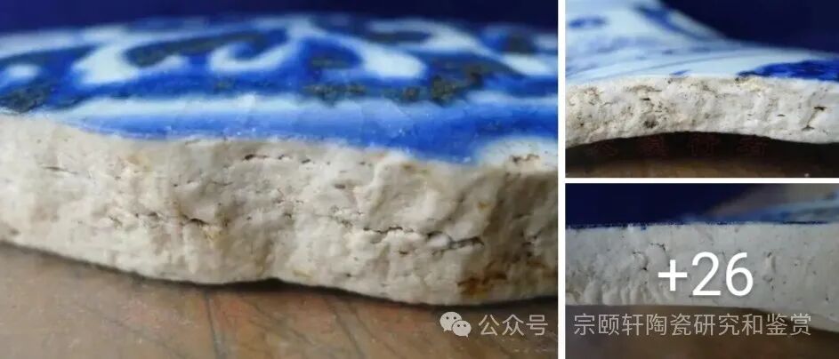 鉴定瓷器真伪,科学的方法是宏观断年代,微观断真假,已成为藏家的共识,我们不仅用眼学看画功造形及胎骨的时代特征,还要用100到500倍显微镜来分辨出用肉眼分不清的真伪特征,抓住瓷器造假无法达到的特点。也就是抓住元青花当代无法仿的特点。那些是元青花无法仿的特点呢?元青花当代无法仿制的第一条就是它的胎体是麻仓土。