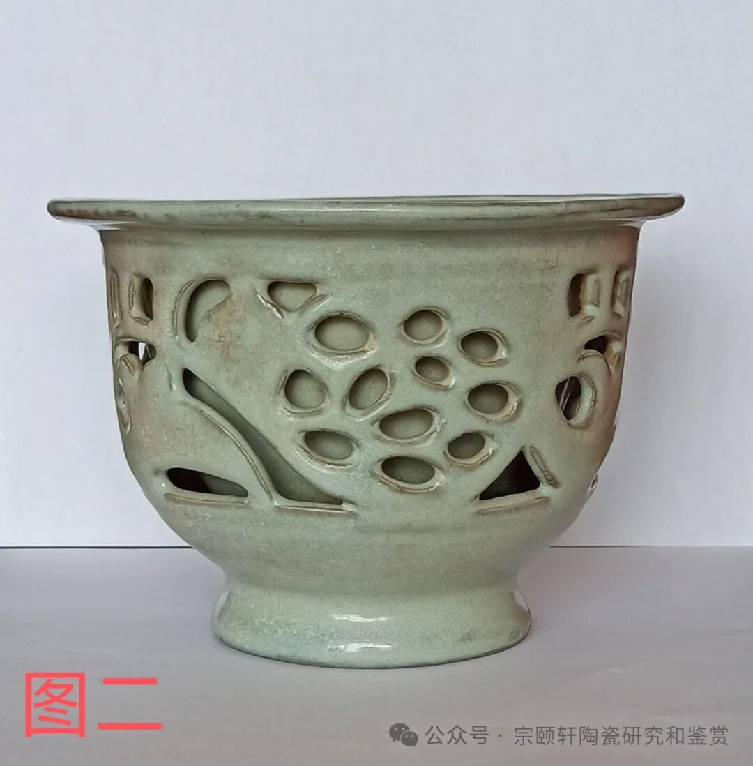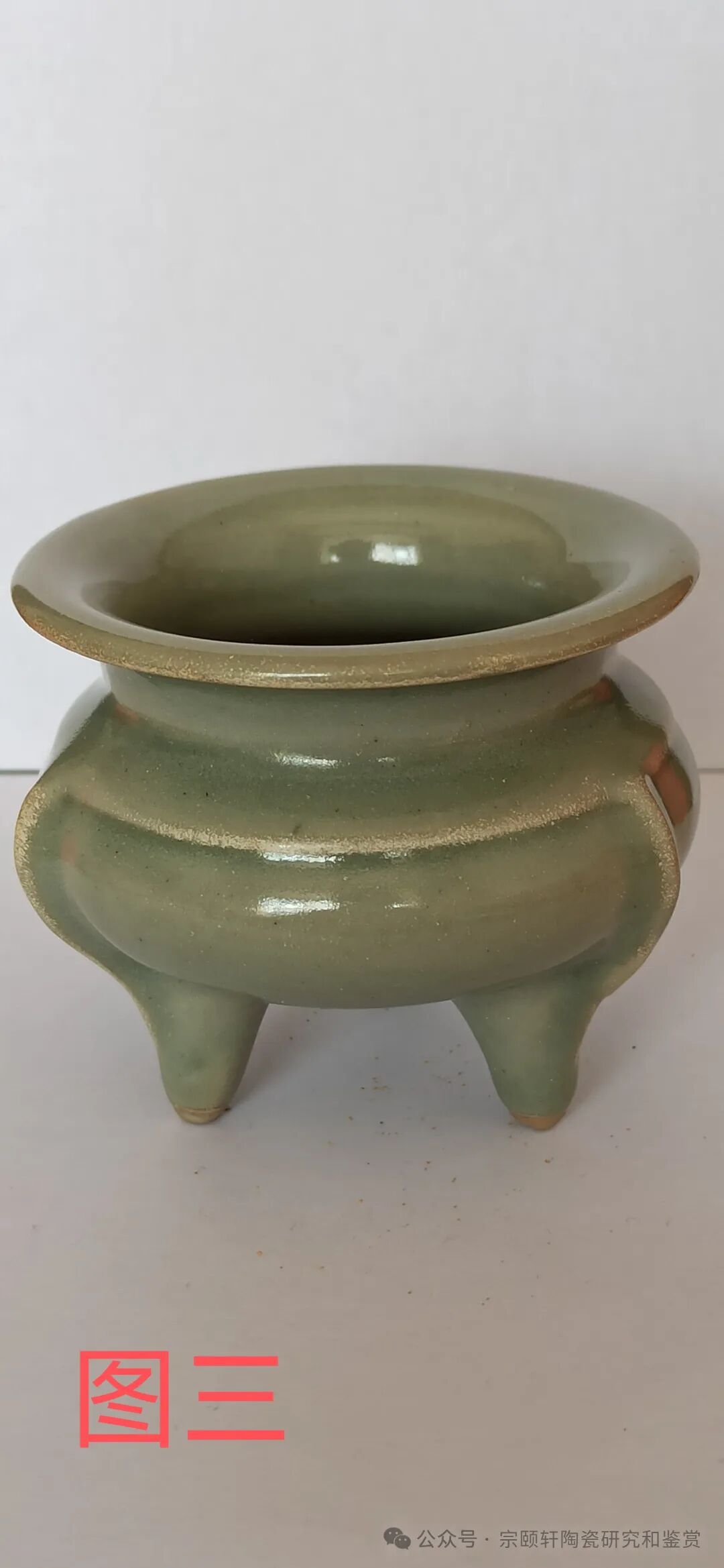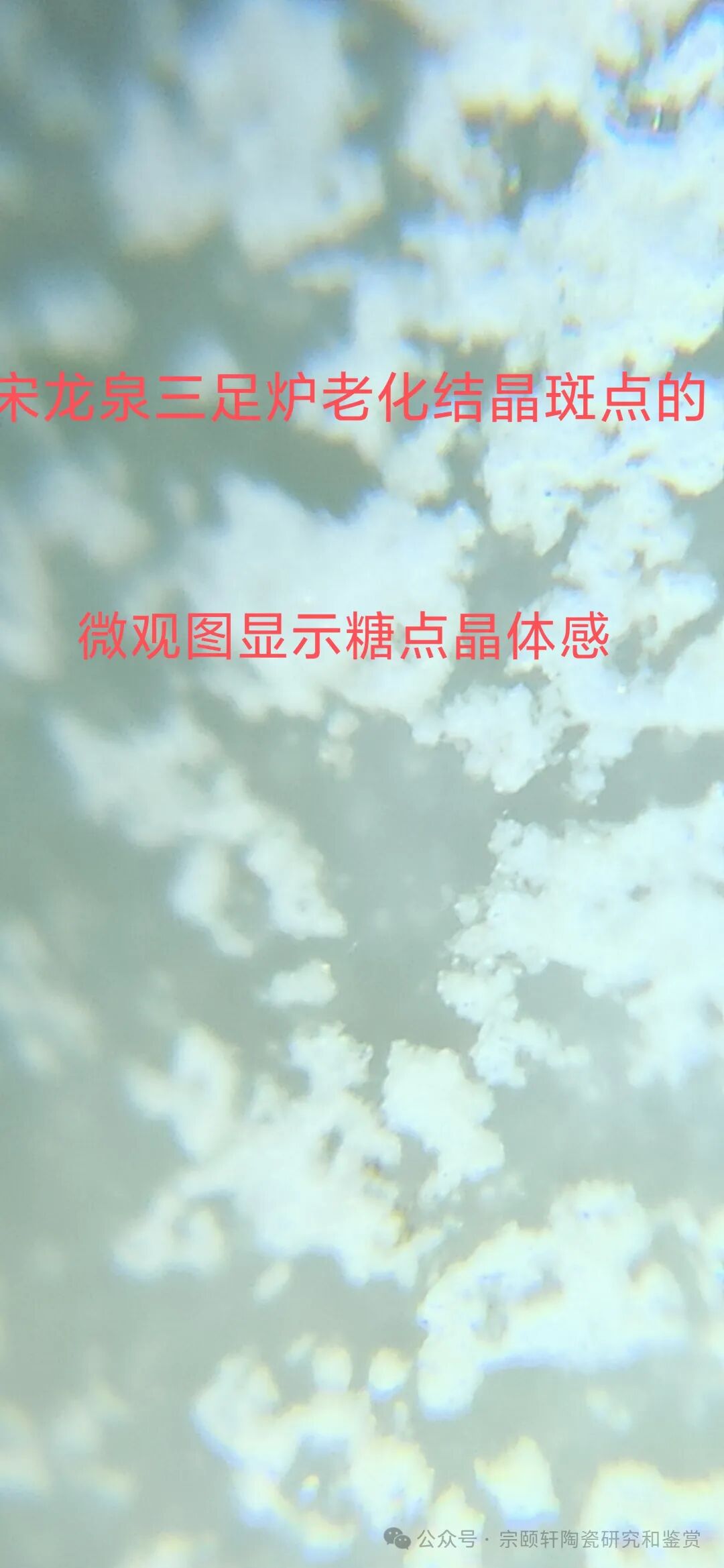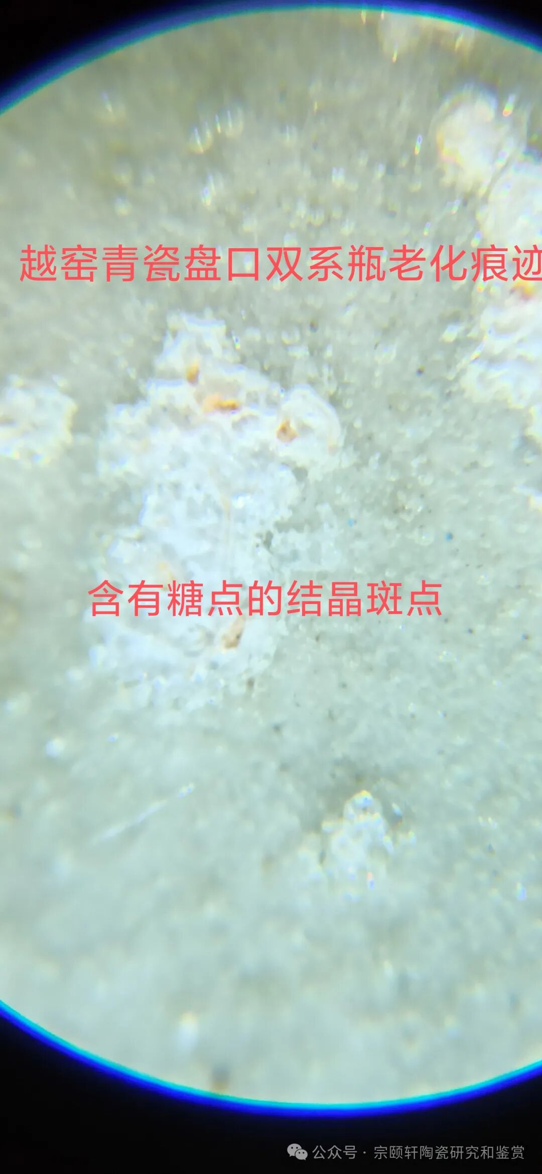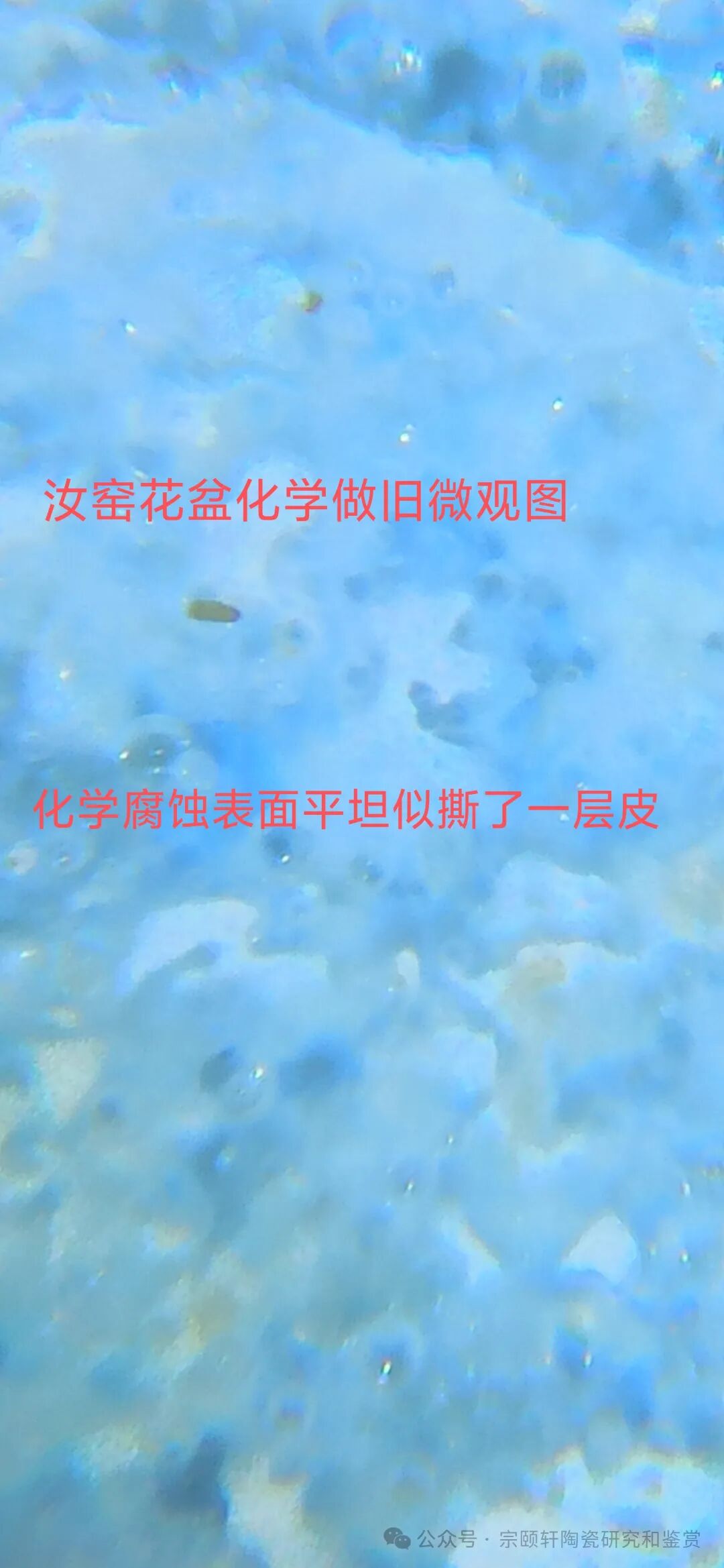图一为宋越窑青瓷剔刻花卉双系洗口瓶,瓶洗口肩带有两系,颈部三根弦纹剔刻花卉刀工一气呵成。单看造型光泽,宝光内含一眼真品无疑。再看器表布满近千年的老化结晶霜斑一眼开门无疑。 再看图二汝窑天青釉镂雕花盆整器制作精致,器身布满老化霜斑,器身各处有深浅不一的开片,造型同样古扑,看光泽也滋润。唯有存疑的汝窑这种造型的花盆没见过,出土的残器都没见过。但没见过不代表不存在。图三龙泉三足鬲式琴炉制作精致小巧古朴,釉极润泽一眼真品无疑。但也有存疑之处。琴炉露胎釉结合处的一线白色霜斑太过均匀。如以上三件古瓷单从宏观眼学去判别其造型、光泽应该都可以判别真品无疑。但也有存疑的地方。在这种情况下就用科学的老化微观去判别一下就可以判别出图一、图三是真品,图二是化学做假