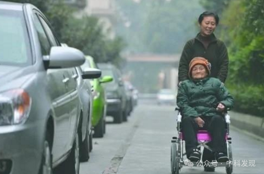 2016年,四川成都的某个住宅小区内,一位中年女性正推着一位坐在轮椅上的老人散步。