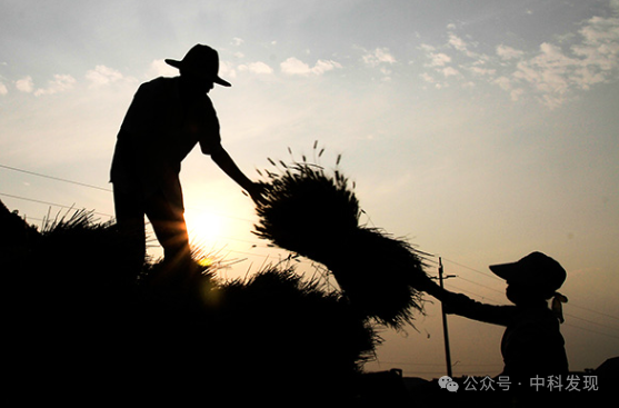 一个十六七岁的少年站在车上负责放麦子,大叔和一个姑娘正在用大杈挑麦装车。