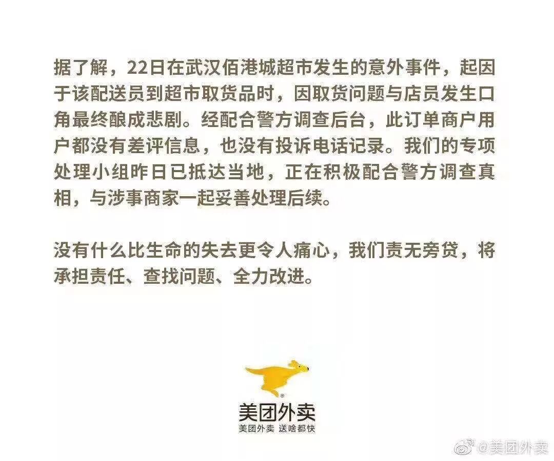 但是,美团否认了这种说法,回应称,外卖员因取货问题和店员发生口角,最终酿成悲剧,此订单商户没有差评信息,也没有投诉电话记录。