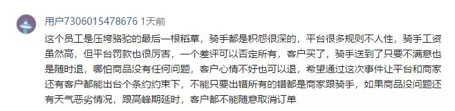 最先出现的声音还是指责美团平台的,大多称其制度过于苛刻,对于外卖小哥的利益没有任何保障措施,要平台反思。