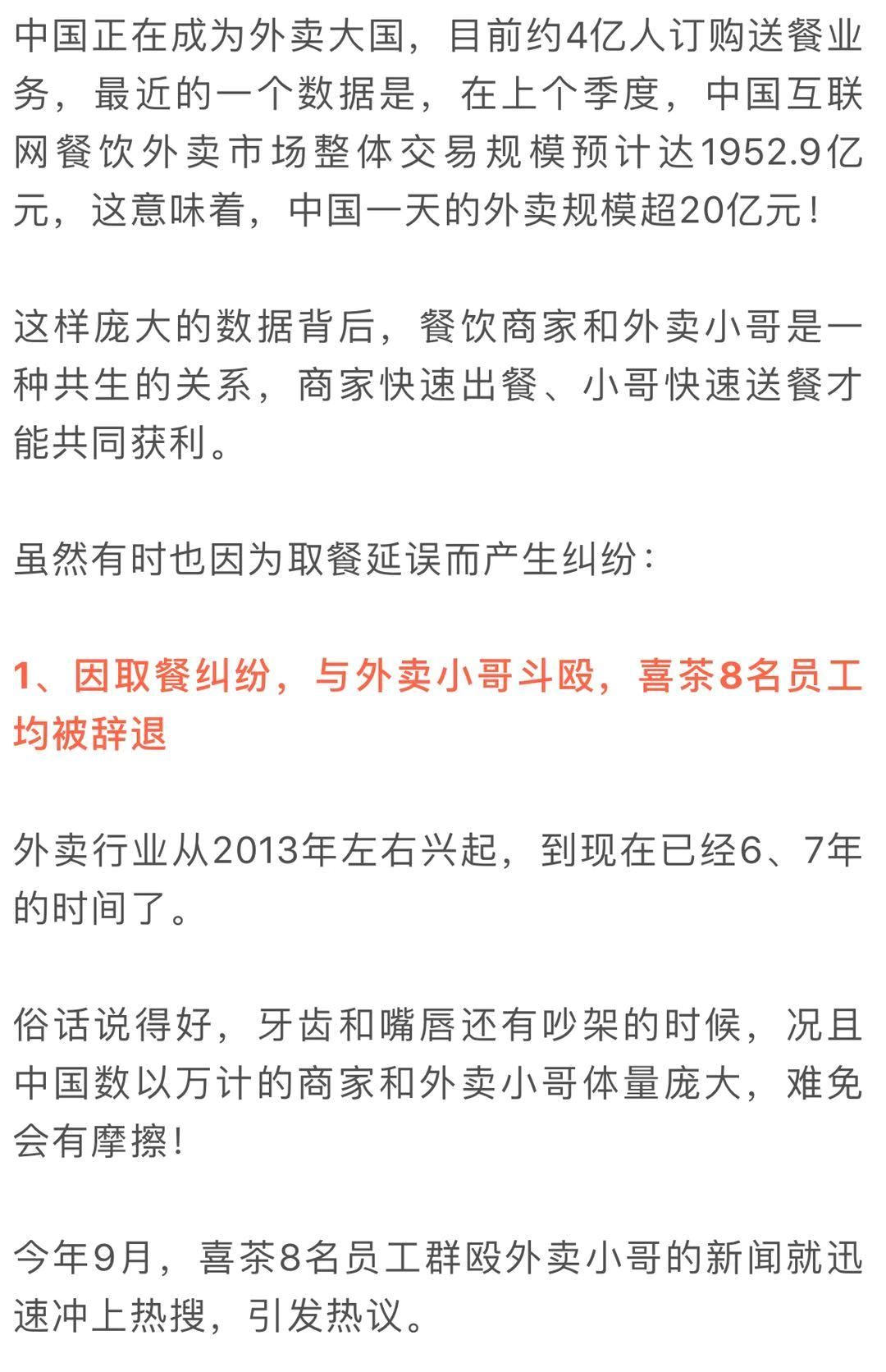 事后,喜茶作出回应,斗殴员工全部开除,慰问外卖小哥终了。