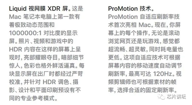 新款MacBook Pro分为14英寸和16英寸两种尺寸,屏幕边框变得更窄,并且像iPhone一样变为“刘海屏”,搭载了Liquid视网膜XDR屏。它还配备了ProMotion自适应刷新率技术,这种技术会根据用户当前所做的事情,自动调节屏幕刷新率,以带来更灵敏的响应。