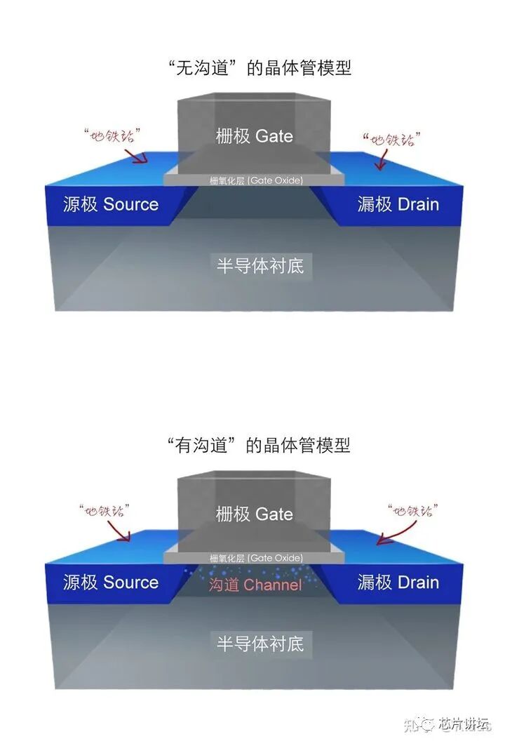 芯片里的晶体管的结构很像是两个挨得很近的“地铁站”建在半导体里 面,“地铁站”里有很多电子,两座地铁站上面有一个控制“按钮”,叫作栅极。当我们给栅极加一个电压,就会在两座地铁站之间形成一个通道,电子就可以通过,电压消失,通道也跟着消失。