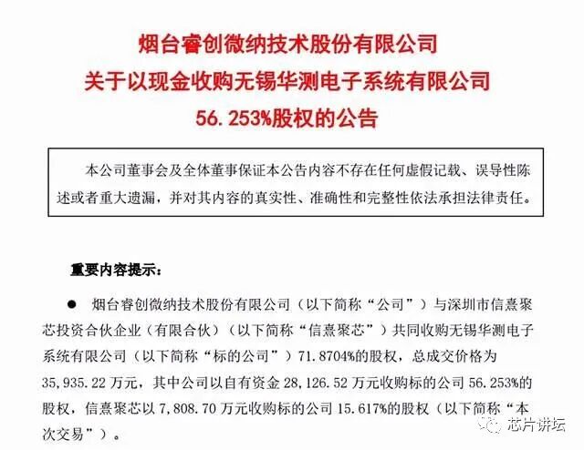 10月7日晚间,睿创微纳公告称,公司拟与信熹聚芯合作,以3.59亿元的价格,共同收购无锡华测电子系统有限公司71.8704%股权。其中,睿创微纳出资2.81亿元收购56.253%股权。
