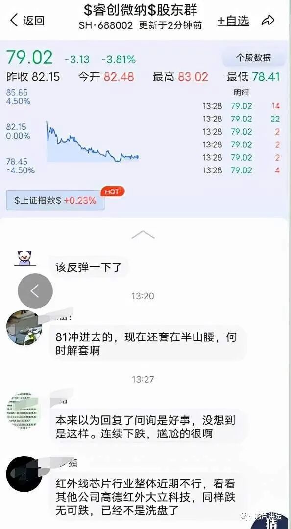 而睿创微纳近期来股价连续下跌,也引起了股民投资者的热议。在尺度APP的睿创微纳股东群里,有投资者表示,“本来以为回复了问询是好事,没想到是这样,连续下跌,尴尬的很啊 !”还有投资者表示,“81冲进去的,现在还套在半山腰,何时解套啊?”