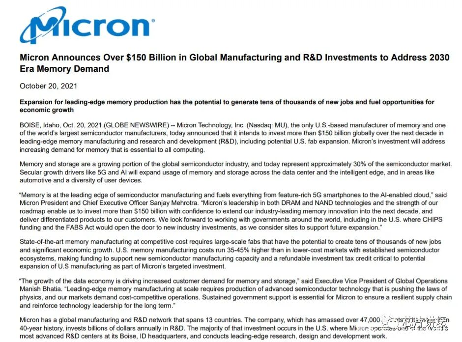 实际上,美光计划在该现有工厂附近采购地皮,以新建工厂项目。预计新工厂的投资将超过50亿美元,将在2024年投入运营,创造数千个就业岗位。