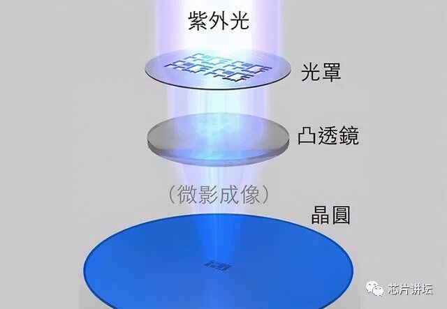 使用特殊的光线对掩模与待加工基片的光刻胶层进行选择性的照射。光刻胶中的感光剂会发生光化学反应,从而使感光区域和非感光区的化学成分发生化学反应变化。