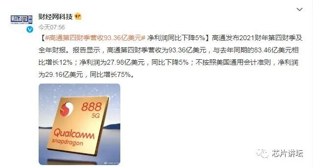 11月4日,美国芯片巨头高通正式发布了2021财年第四财季以及全年财报。根据财报内容显示,高通公司在第四财季实现营收93.36亿美元,相比2020年同期增长12%。