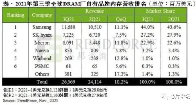 首先来看一下储存芯片细分的DRAM市场,根据知名市场调研机构集邦资讯公布的数据显示,在2021年第三季度全球DRAM厂商营收排行榜中,三星、SK海力士以及美光科技占据前三,其中,三星占据44%的市场份额,名副其实的DRAM市场巨头。