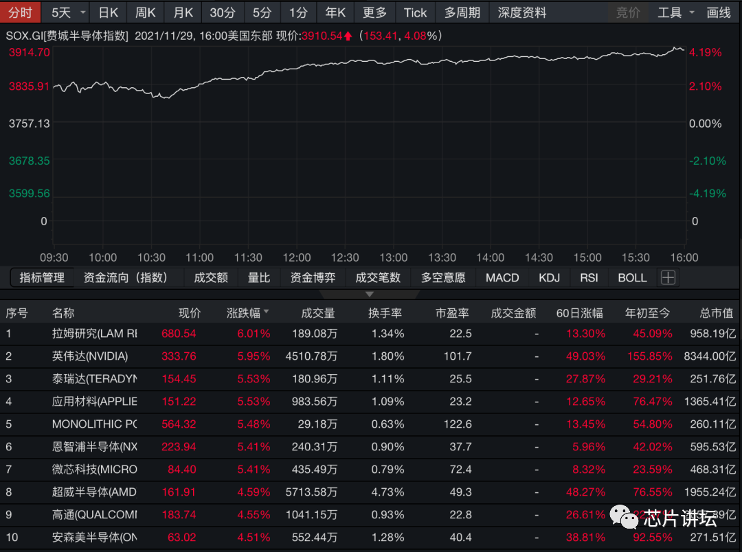 当地时间11月29日,费城半导体指数高开高走,收盘时涨4.08%;板块内,拉姆研究涨逾6%,英伟达、泰瑞达、应用材料、恩智浦半导体、微芯科技均涨逾5%。