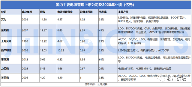 不难发现,已上市电源管理芯片厂商多数成立于2010年之前,正在排队IPO的则大多成立于2012年之后,也就是说,绝大多数国内电源管理芯片厂商成立不到20年,这对于产品数量很大程度上决定了公司营收规模的模拟芯片市场而言,积累还太少。因此,目前LDO还是中国电源管理芯片需求最大的单一产品,但LDO处于低端市场,主要是本土企业的竞争,面临巨大的成本压力,其他电源产品中,PMU、电池相关应用、DC/DC和驱动芯片增长较多。