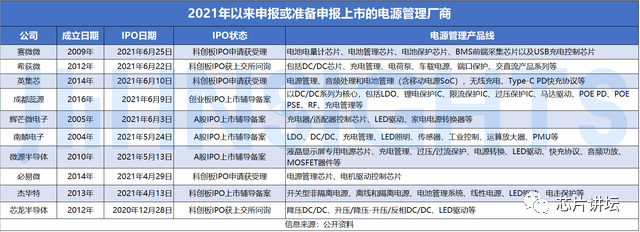 一方面,电源管理芯片的缺货、涨价潮席卷全球,对A股相关上市公司的业绩起到了极大的助推作用。数据显示,主业涉及电源管理芯片的几家半导体设计公司,一年来营收、净利均录得同比大幅增长。另一方面,今年以来,还有一长串电源管理公司在排队等待IPO。集微网整理了今年以来申报或准备申报上市的电源管理厂商,如下图。