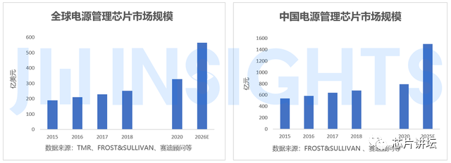 电源管理芯片应用场景丰富,随着5G、物联网、新能源汽车等下游市场发展,电子设备品类和数量都快速增长,从而带动电源管理芯片需求持续扩大。综合多家研究公司数据显示,2020年全球电源管理芯片市场规模达到328.8亿美元,预计2026年将达到565亿美元,年复合增长率达10.69%;2020年中国电源管理芯片市场规模约为800亿元,2020年至2025年间年复合增长率高达14.7%。