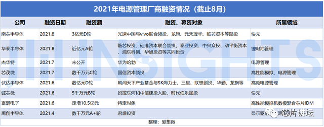 集微咨询整理了今年截止8月份电源管理领域的投融资案例。从近两年电源管理领域的初创企业和资本投资热点来看,智能手机、快充、TWS耳机等热门赛道的优质企业成为市场青睐的标的。这意味着,如果电源管理厂商面向的下游领域增长较为迅速,则会有更多新的市场空间来供其开辟,企业也会有更多机会可以快速成长。而随着华为、小米等头部终端厂商加入芯片投资行列,也使得芯片厂商和下游客户合作的黏性和可持续性提高。