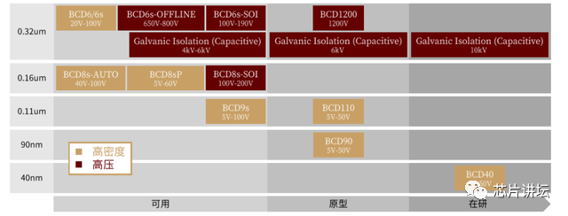高压BCD。高压BCD通常可集成耐压100-700V范围的器件,其难点在于在制程不断缩小的情况下兼容低压控制电路和耐高压功率器件DMOS。高压BCD在电子照明及工控中广泛应用。