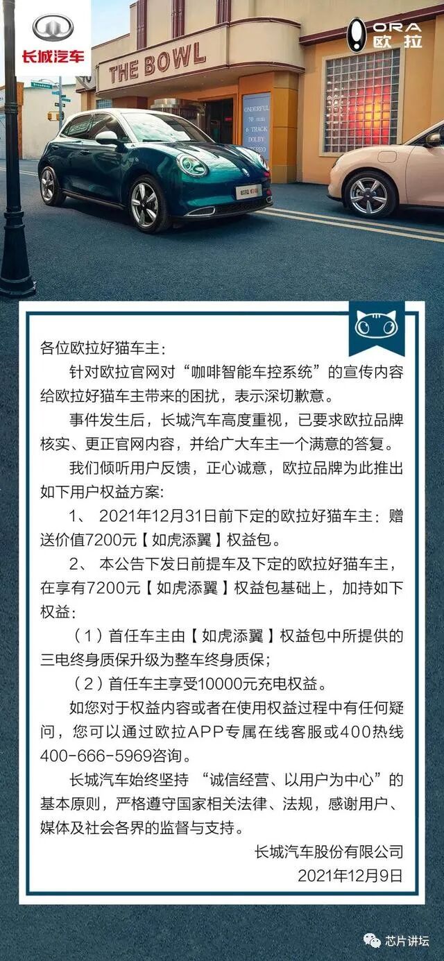 12月9日,长城汽车发布道歉函,并解释说明给欧拉好猫用户造成的困扰,主要原因是因为好猫没有将参数配置表中涉及的芯片全部写上去造成的。