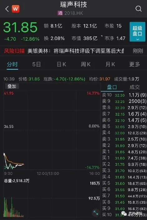 10月8日,瑞声科技开盘后一度暴泻,早盘最低至31.15港元,创52周新低,也是2018年以来最低。截至发稿时,瑞声科技股价仍跌12.86%,报31.85港元。