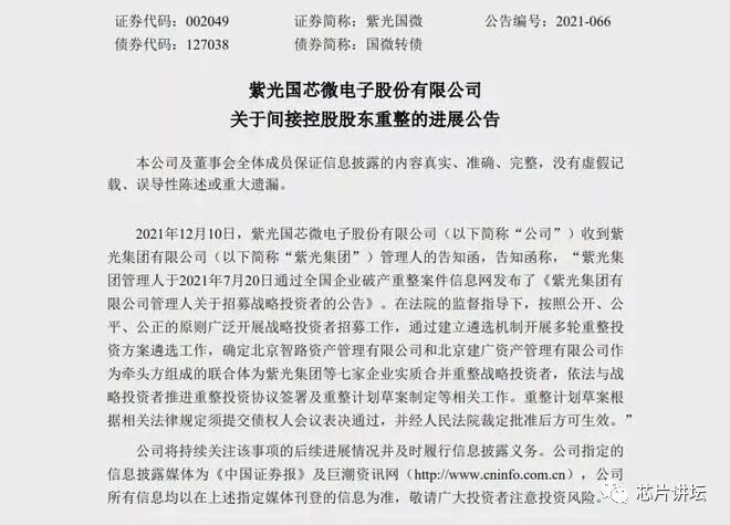 今年7月16日,北京一中院裁定受理相关债权人对间接控股股东紫光集团的重整申请,并指定紫光集团有限公司清算组担任紫光集团管理人。