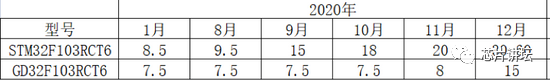 话至此处,阿飞用两款之前被热炒的芯片举了个例子,一个是GD32F103RCT6,另一个是STM32F103RCT6。从代码可以看出,二者的区别仅仅在开头的厂家——GD是国产厂家兆易创新,STM则是意法半导体。老胡拿到的数据显示,在2020年,这两款芯片的差价并不大,STM售价10元,GD则在7.5元。但从2020年8月开始,STM的售价便开始猛涨,到年底上涨了3倍到6倍。GD的同款虽然也涨,但只有1倍的涨幅。