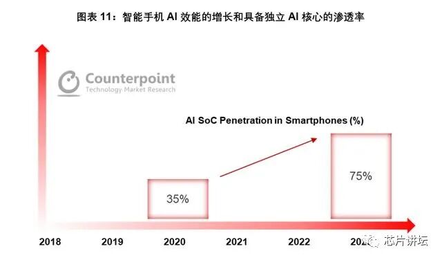 据Counterpoint《5G旗舰智能手机芯片发展趋势》白皮书表示:2020年,由专用人工智能元素的SoC驱动的智能手机比例预计约为35%。我们预计这一渗透率将在2023年提升至75%以上。换言之,未来1-2年,AI内核不仅会运用在旗舰智能手机上,还会在主流机型中得到很好的应用。